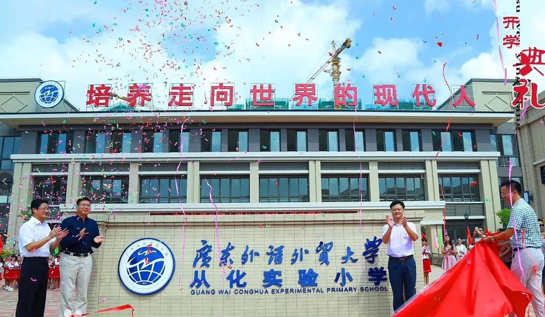 广东外语外贸大学从化实验小学(简称“从化广外实小”)是由广东外语外贸大学、从化区教育局与珠光投资集团三方合作创办的区直属公办小学,2017年9月正式揭牌开办。该校位于广州市从化区105国道九里步珠光御景山水城花园内,占地面积30000平方米,建筑面积10500平方米,办学规模为36个班,可容纳1600多名学生。截至2023年11月共开设43个教学班,在校学生1775人,配有教职工101人。